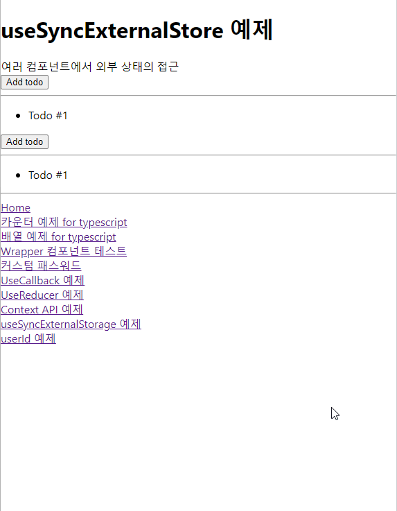 그럼에도 불구하고 어떤 컴포넌트에서든지 다음과 같이 useSyncExternalStore로 접근하게 되면 동일한 값을 활용하고, 마치 useState의 상태처럼 재렌더링까지 할 수 있게 됩니다.