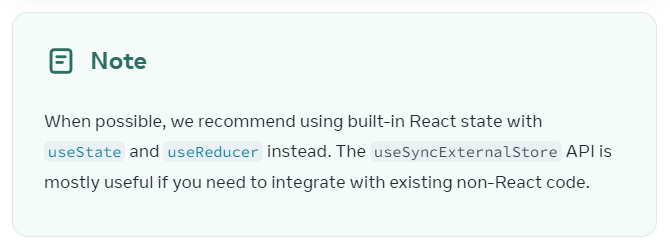 리액트 공식 문서에서 찾을 수 있는 NOTE 이다. React 코드가 아닌 어떤 API (ex. 상태 관리 라이브러리)와 통합할 때 굉장히 유용하다고 합니다. 즉, React가 상태관리를 정상적으로 하고 있는 상황이라면 useState나 useReducer로 상태 관리를 하도록 권장하고 있습니다.