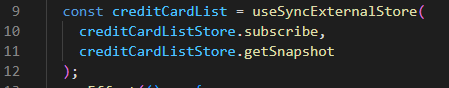 import { creditCardListStore } from 'stores/creditCardListStore'; import { useSyncExternalStore } from 'react'; function Home() { const creditCardList = useSyncExternalStore( creditCardListStore.subscribe, creditCardListStore.getSnapshot ); ...이렇게만 말하면 무슨 소리인지 이해하기가 어려우니 스냅샷을 다루는 코드까지 첨부를 하겠습니다.