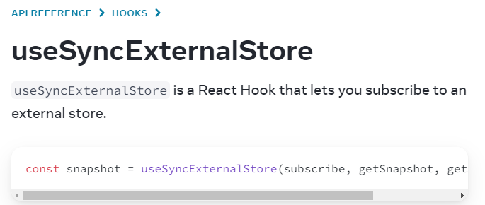 즉, 이런 티어링 문제를 해결하기 위해서 타사의 라이브러리와의 연결을 할 어떤 기능이 필요했고, 개발 과정에서 useMutableSource 같은 기능들이 제시되었지만 결국 useSyncExternalStore이 출시되는 것으로 확정이 되었습니다.
