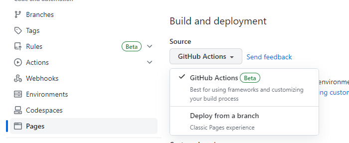 그리고 Build and deployment의 Source를 GitHub Actions를 눌러주면 됩니다.