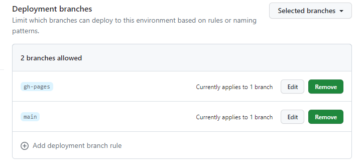 Add deployment branch rule를 누른 후, 배포하려는 브랜치를 추가해주시면 됩니다.