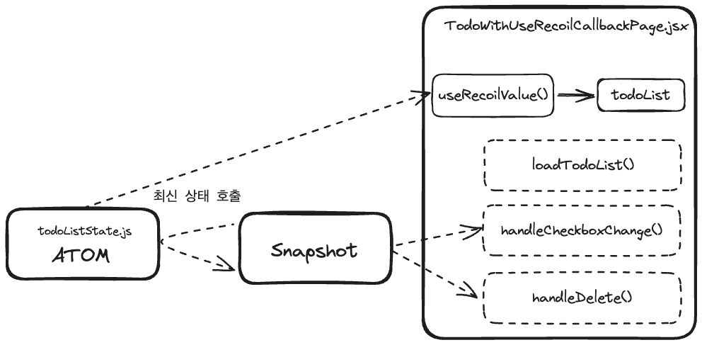 useRecoilCallback()을 사용하여 비동기 작업을 처리하고, 필요한 경우 Snapshot을 사용하여 상태의 일관성을 유지하면서 작업을 수행할 수 있습니다.