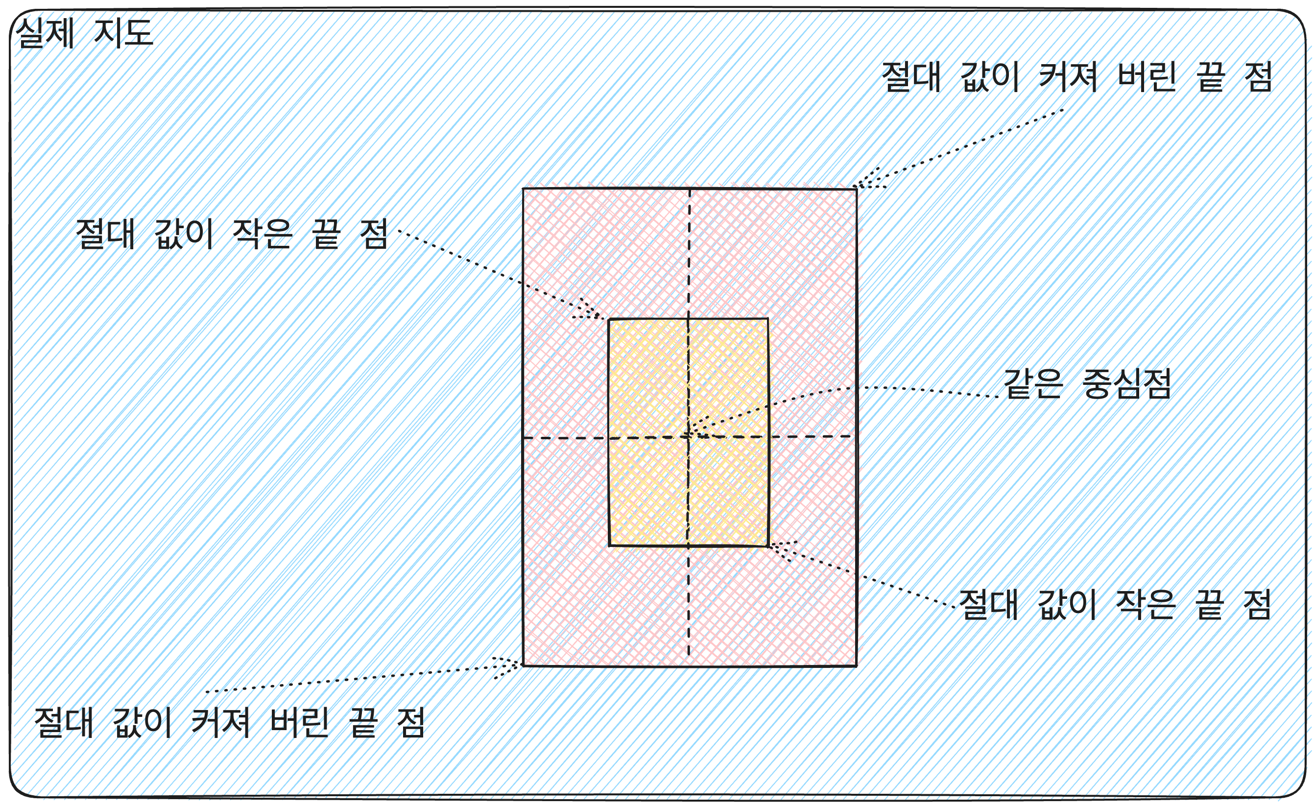 예를 들어 사용자가 지도를 많이 축소한 경우에는 중심 점 p0은 그대로지만 양 끝점 p1, p2의 위치가 점점 중심 점 p0으로 부터 멀어질 것입니다.