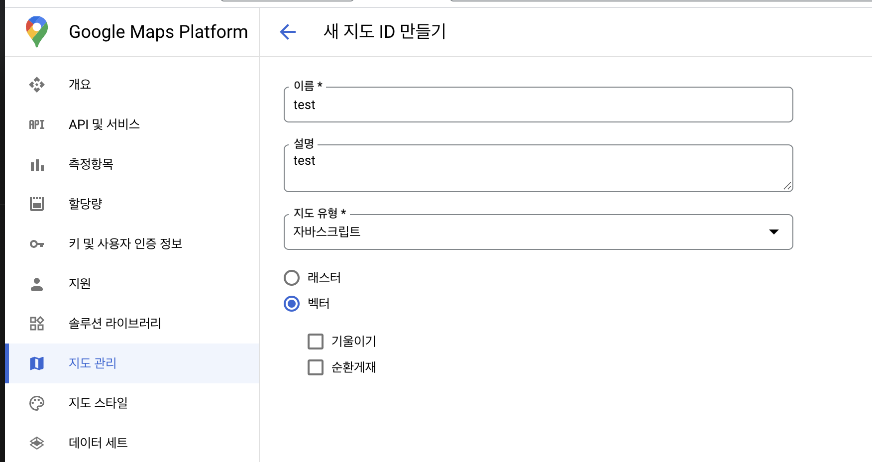 지도 유형은 자바스크립트, 벡터지도를 선택해야 합니다.