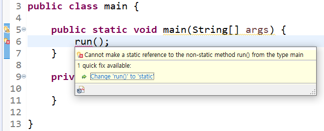 public class main { public static void main(String[] args) { run(); } private void run() { System.out.println("Leirbag"); } }이 코드에서 실행을 하게되면 다음과 같은 오류가 발생합니다.