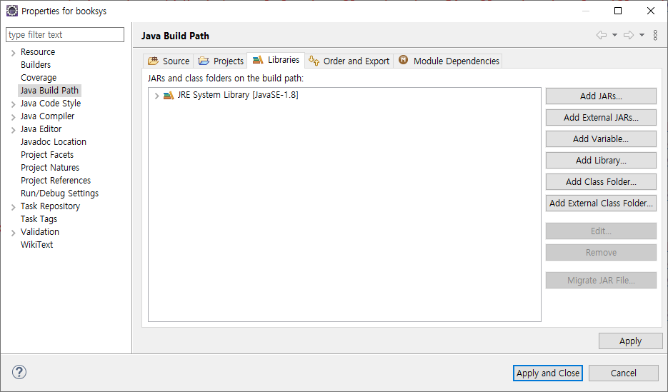 Java Build Path - Libraries에 들어와서 Add JARs...를 누릅니다.