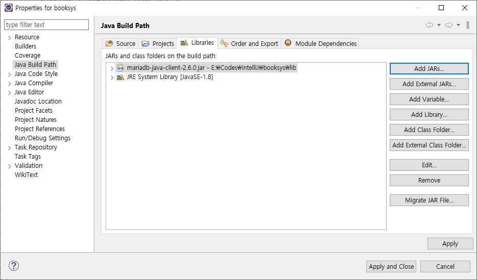 프로젝트 내에 있는 lib 폴더에서 mariadb jar 파일을 선택합니다.