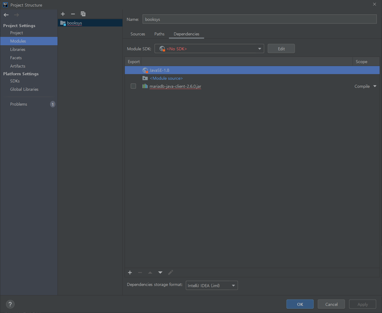 1. Settings - ProjectStructure - ProjectSettings - Modules - Dependencies에 들어갑니다.