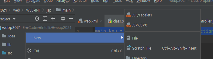 web 폴더의 WEB-INF에 우클릭 후 New - File을 누르고 class.properties라고 입력하여 추가합니다.
