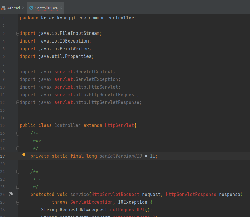 <?xml version="1.0" encoding="UTF-8"?> <web-app xmlns="http://xmlns.jcp.org/xml/ns/javaee" xmlns:xsi="http://www.w3.org/2001/XMLSchema-instance" xsi:schemaLocation="http://xmlns.jcp.org/xml/ns/javaee http://xmlns.jcp.org/xml/ns/javaee/web-app_4_0.xsd" version="4.0"> <welcome-file-list> <welcome-file>index.jsp</welcome-file> </welcome-file-list> <servlet> <servlet-name>Controller</servlet-name> <servlet-class>kr.ac.kyonggi.swaig.common.controller.Controller</servlet-class> </servlet> <servlet-mapping> <servlet-name>Controller</servlet-name> <url-pattern>*.kgu</url-pattern> </servlet-mapping> </web-app>(일반적으로 url-pattern을 *.do로 하는 경우가 많지만, 저는 학과 홈페이지를 만들고 있기 때문에 학교 약자에 맞춰서 *.kgu로 설정했습니다.)