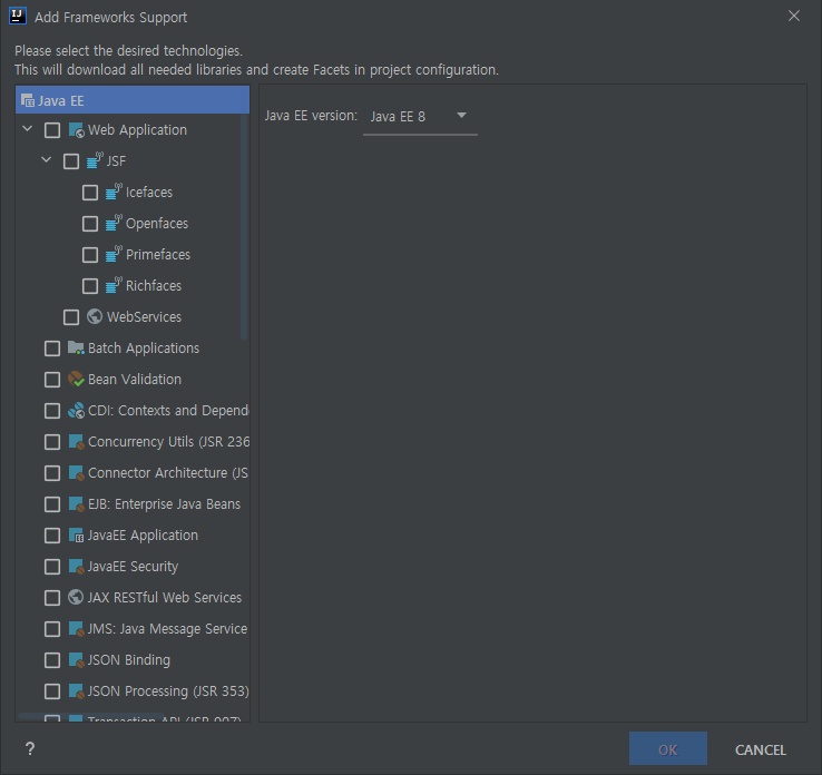 Java EE version이 아래 사진처럼 Java EE 8로 되어있어야 합니다.