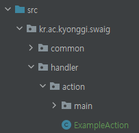 src/kr.ac.kyonggi.sawig/handler/action에 ExampleAction 클래스를 추가해줍니다.