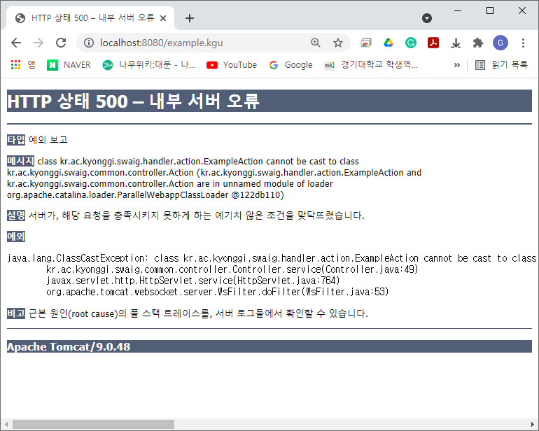 지난번에도 설명을 했지만, 복습을 위해 다시 설명하면 .kgu로 끝나는 url 요청은 Controller클래스로 보낼 것이고 example.kgu를 class.properties에서 검색해야하는데, 정의한 것이 없기 때문에 오류가 발생하는 것입니다.