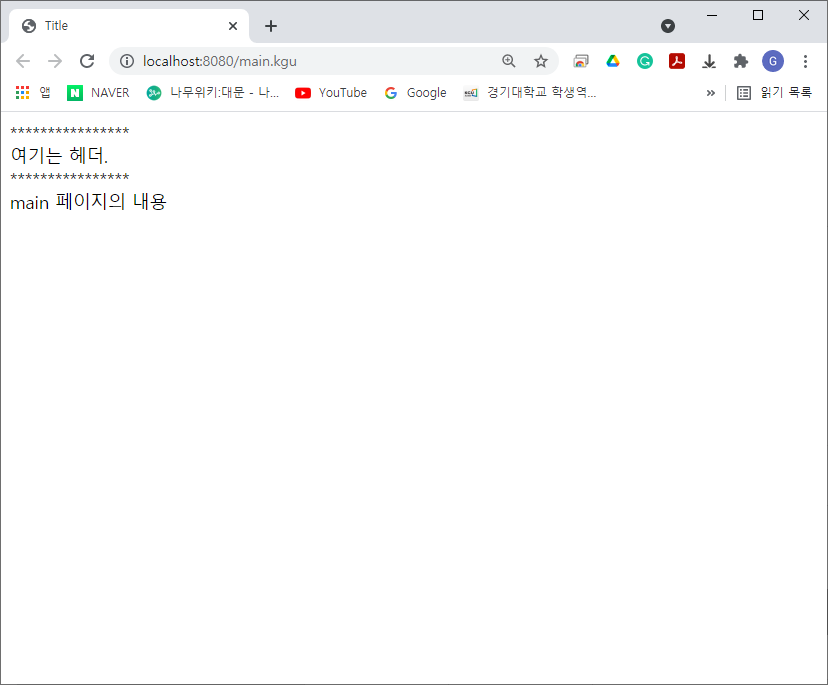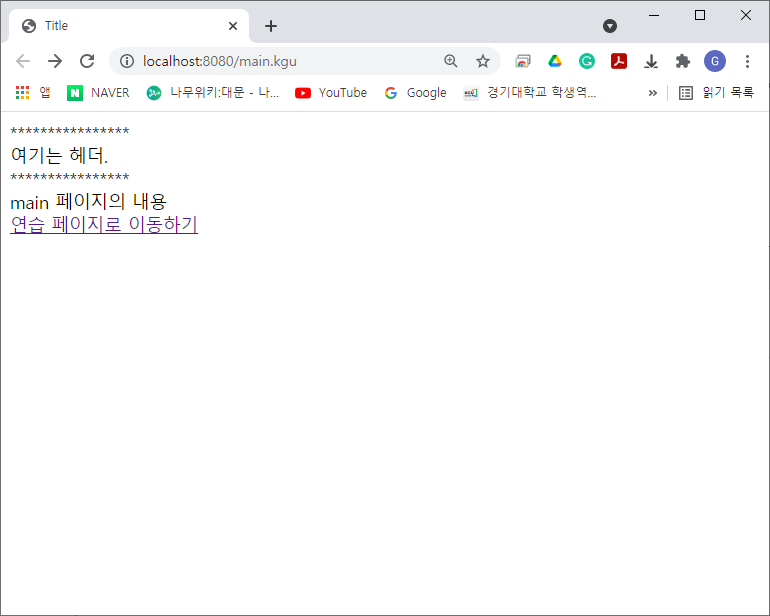 <%@ page contentType="text/html;charset=UTF-8" language="java" %> <html> <head> <title>Title</title> </head> <%@include file="./header.jsp"%> <body> main 페이지의 내용<br> <a href="example.kgu">연습 페이지로 이동하기</a> </body> </html>이렇게 해서 실행해보면 메인화면이 다음과 같이 변합니다.