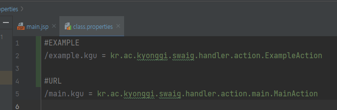 #EXAMPLE /example.kgu = kr.ac.kyonggi.swaig.handler.action.ExampleAction #URL /main.kgu = kr.ac.kyonggi.swaig.handler.action.main.MainAction이제 ExampleAction을 만들어줄 차례입니다.