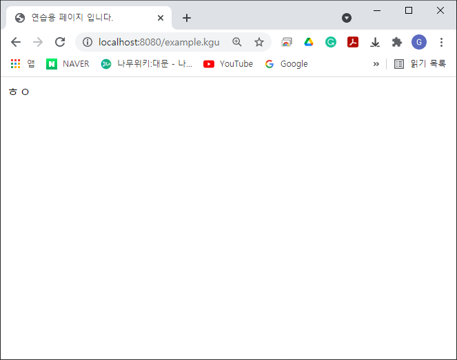 <%@ page contentType="text/html;charset=UTF-8" language="java" %> <html> <head> <title>연습용 페이지 입니다.</title> </head> <body> ㅎㅇ </body> </html>이렇게 하면 새 페이지를 만들기 위한 모든 준비가 끝납니다. 이제 실행해서 아까의 그 오류나던 링크를 눌러보면